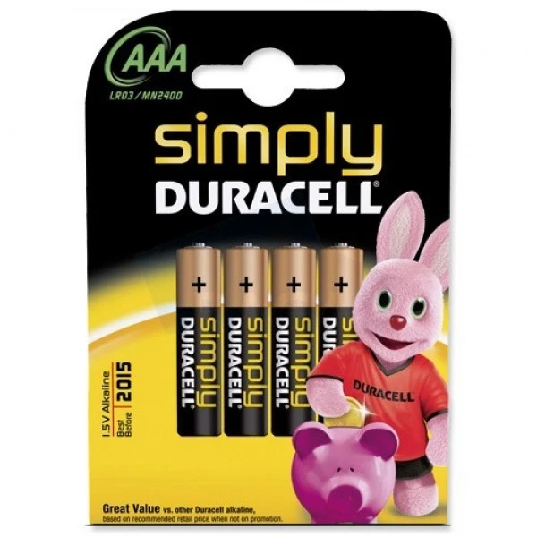 Duracell Simply AAA betekent kwalitatieve Duracell batterijen aan een toegankelijke prijs die echt voordelig zijn t.o.v. de andere alkalinebatterijen van Duracell*. Vereenvoudig uw leven met een betrouwbare stroombron als Duracell Simply � best te gebruiken in apparaten met een laag-tot-gemiddeld stroomverbruik, afstandsbedieningen of klokken. Duracell Simply batterijen zijn verkrijgbaar als AA en AAA.
